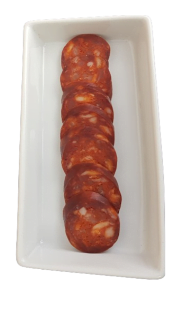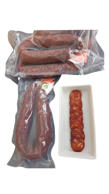 Elaborado según el método tradicional con magro de paleta, jamón y panceta de cerdo; adobado con pimentón, sal, ajo y orégano para después pasar a su curación en leña de roble. Así se consigue el sabor tradicional. Sin gluten, sin colorantes y sin conservantes.