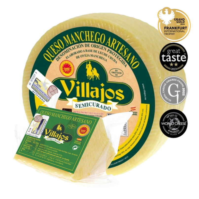 Queso Manchego semicurado artesano de pasta prensada elaborado con leche cruda de oveja de raza manchega y una maduración de entre 3 y 6 meses.